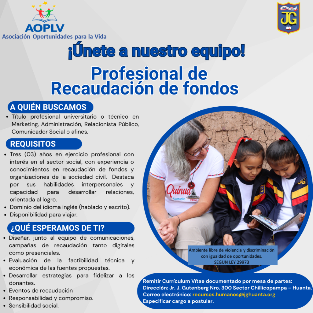 Profesional de Recaudación de FondosConvocatoria, No Vigente / mayo 15, 2025 Ven y se parte de esta gran familia. Remitir currículum vítae al correo electrónico, indicando el puesto al que postula: 𝗿𝗲𝗰𝘂𝗿𝘀𝗼𝘀.𝗵𝘂𝗺𝗮𝗻𝗼𝘀@𝗷𝗴𝗵𝘂𝗮𝗻𝘁𝗮.𝗼𝗿𝗴